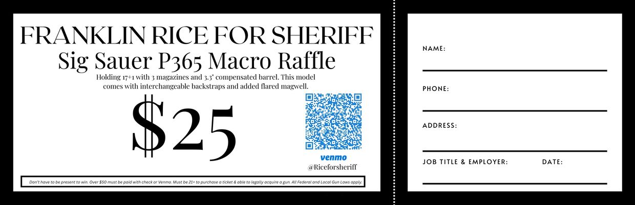 • Donations over $50 must be made through Venmo (@Riceforsheriff) or by check payable to Rice for Sheriff Campaign